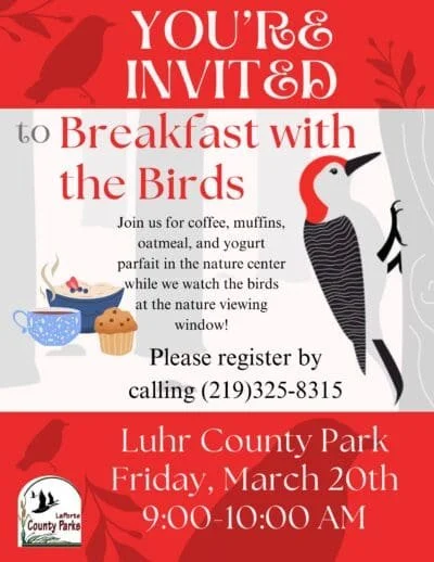 You're invited to Breakfast with the Birds at Luhr County Park! Enjoy coffee, muffins, oatmeal, and a yogurt parfait in the nature center while watching the birds at the nature viewing window. A peaceful and relaxing way to start your morning surrounded by nature.