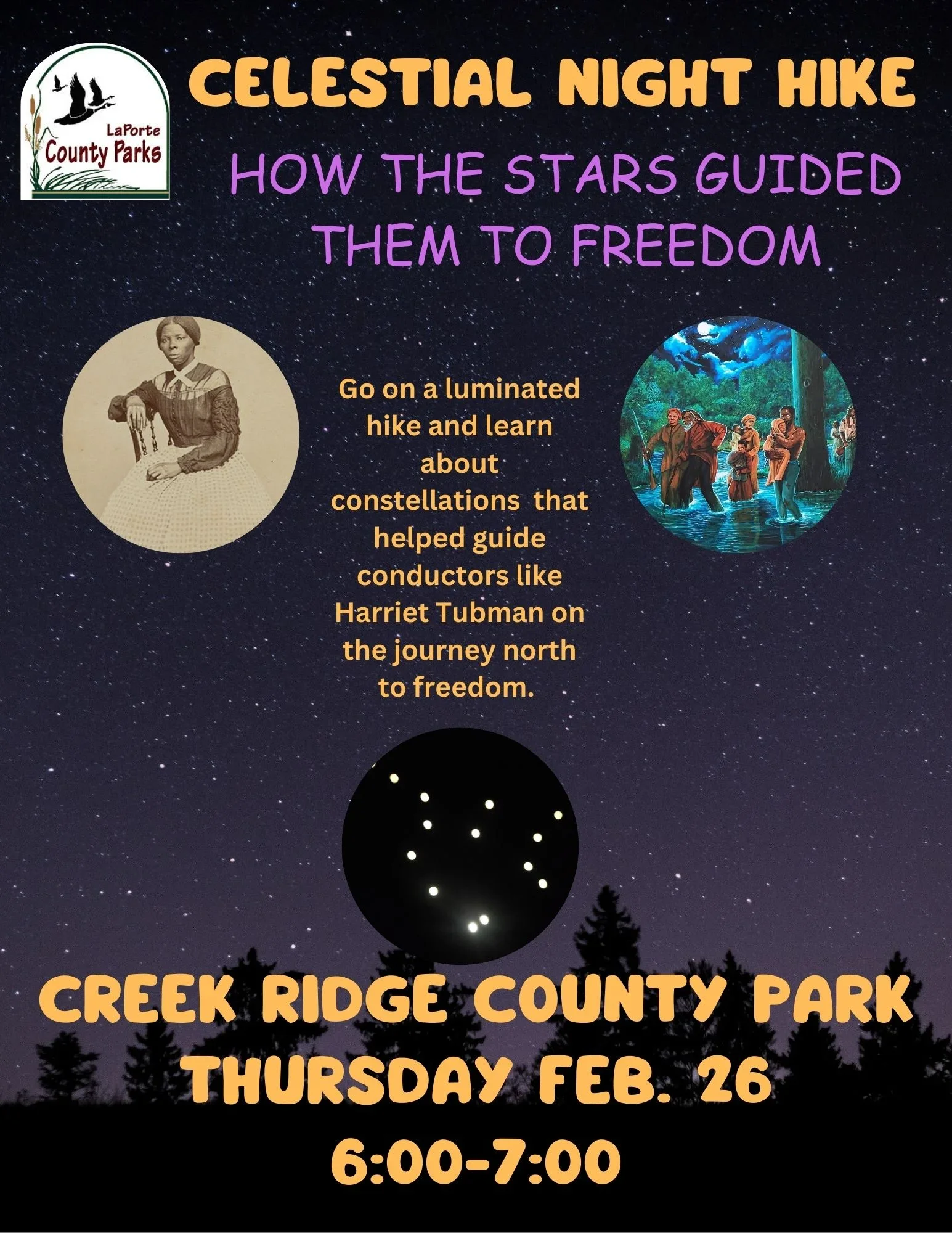 Learn how enslaved people used the night sky as a guide on their journey to freedom. This educational program explores the role of stars and constellations in navigation along the Underground Railroad, combining history and astronomy in an engaging, family-friendly hike.