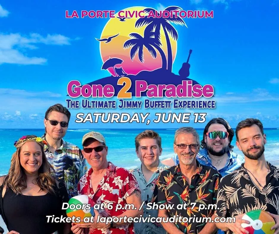 Get ready, Parrotheads! Gone 2 Paradise, the Ultimate Jimmy Buffett Experience, is coming to the La Porte Civic Auditorium on Saturday, June 13! With over 20 years of celebrating the legendary music of Jimmy Buffett, Gone 2 Paradise knows how to recreate the magic of a tropical getaway, no plane ticket required. From the moment the first chord hits, you'll be swept away to Margaritaville, surrounded by the sound of steel drums, the rhythm of the waves, and the spirit of a Buffett concert. Doors open at 6 PM, show starts at 7 PM. "Parrotheads" Balcony Four Pack for just $60 ($15 per seat). Floor options including Reserved Tables and General Admission start at $30 per person. Purchase tickets at laportecivicauditorium.com or at the Civic Auditorium Office!