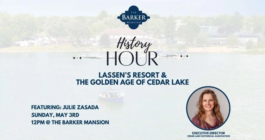 Guest speaker Julie Zasada brings deep passion and expertise to the subject. As Executive Director of the Cedar Lake Historical Association, she presents Cedar Lake history at The Museum at Lassen's Resort and aboard Dewey Line resort history cruises, writes grants to fund restoration projects, and has personally helped renovate the 105-year-old historic hotel. This is a wonderful opportunity to discover a fascinating chapter of regional history. The program runs from 12:00 to 12:45pm at the Barker Mansion in Michigan City.