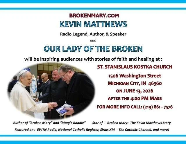 St. Stanislaus Kostka Church welcomes former Chicago radio legend Kevin Matthews, author of "Broken Mary" and "Mary's Roadie" and star of the documentary "Broken Mary: The Kevin Matthews Story." Kevin will be inspiring audiences with stories of faith and healing following the 4:00 PM Mass on June 13, 2026. Featured on EWTN Radio, National Catholic Register, Sirius XM The Catholic Channel, and more. For more information call (219) 861-7576.