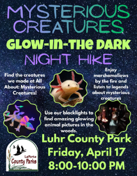 Head out into the dark at Luhr County Park for the Mysterious Creatures Glow-in-the-Dark Night Hike! Use blacklights to find amazing glowing animal pictures hidden in the woods, find the creatures made at the All About: Mysterious Creatures program, roast a marshmallow over the fire, and listen to legends about mysterious creatures from around the world.
