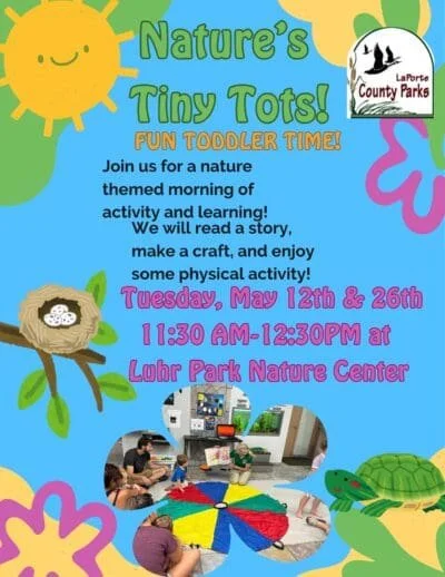 Bring your little one in for a nature-themed morning of activity and learning at Luhr Park Nature Center! We'll read a story, make a craft, and enjoy some physical activity together. Perfect for toddlers and their families. Free to attend and no registration needed!