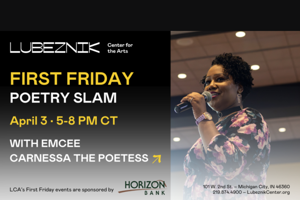 Lubeznik Center for the Arts' Annual Poetry Slam gives performers of all walks of life an excellent platform for sharing their original works! Conducted tournament-style, performers will be eliminated each round with the last one standing crowned this year's LCA Poetry Slam Champion. Carnessa the Poetess hosts the evening with readings beginning at 5:30 PM, with audience members acting as judges for this raucous but friendly competition. Admission is free - come cheer on the performers, explore LCA's art exhibitions, and enjoy the cash bar and complimentary light refreshments. Poets wishing to compete should prepare three original pieces each under three minutes and register by contacting Jessie Sexton at jsexton@lubeznikcenter.org or calling (219) 874-4900 ext. 107.