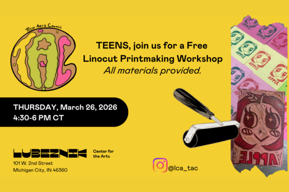 Teens, join at the Lubeznik Center for the Arts for a hands-on linocut demo and stamp-making workshop! Participants will learn the basics of linocut printmaking, including how to safely carve designs into linoleum blocks and transfer their image onto paper. Teens will create their own custom stamps and experiment with printing techniques to make unique, repeatable designs. Linocut is a fun and accessible form of relief printmaking perfect for exploring bold shapes, high contrast, and creative pattern-making. Free for all local teens ages 13–18 - all materials provided. Contact Education Director Nelsy Marcano at nmarcano@lubeznikcenter.org or call (219) 874-4900 to register.
