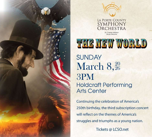 Continuing the celebration of America's 250th birthday, the La Porte County Symphony Orchestra's third subscription concert will reflect on the themes of America's struggles and triumphs as a young nation. The program opens with Charles Ives' Variations on America, followed by two pieces inspired by Abraham Lincoln - Aaron Copland's Lincoln Portrait and Stella Sung's Lincoln's Battle. Closing the concert is Dvorák's Symphony No. 9, the New World Symphony, written during his brief but significant time in New York City and inspired by African American spirituals and Native American traditions.